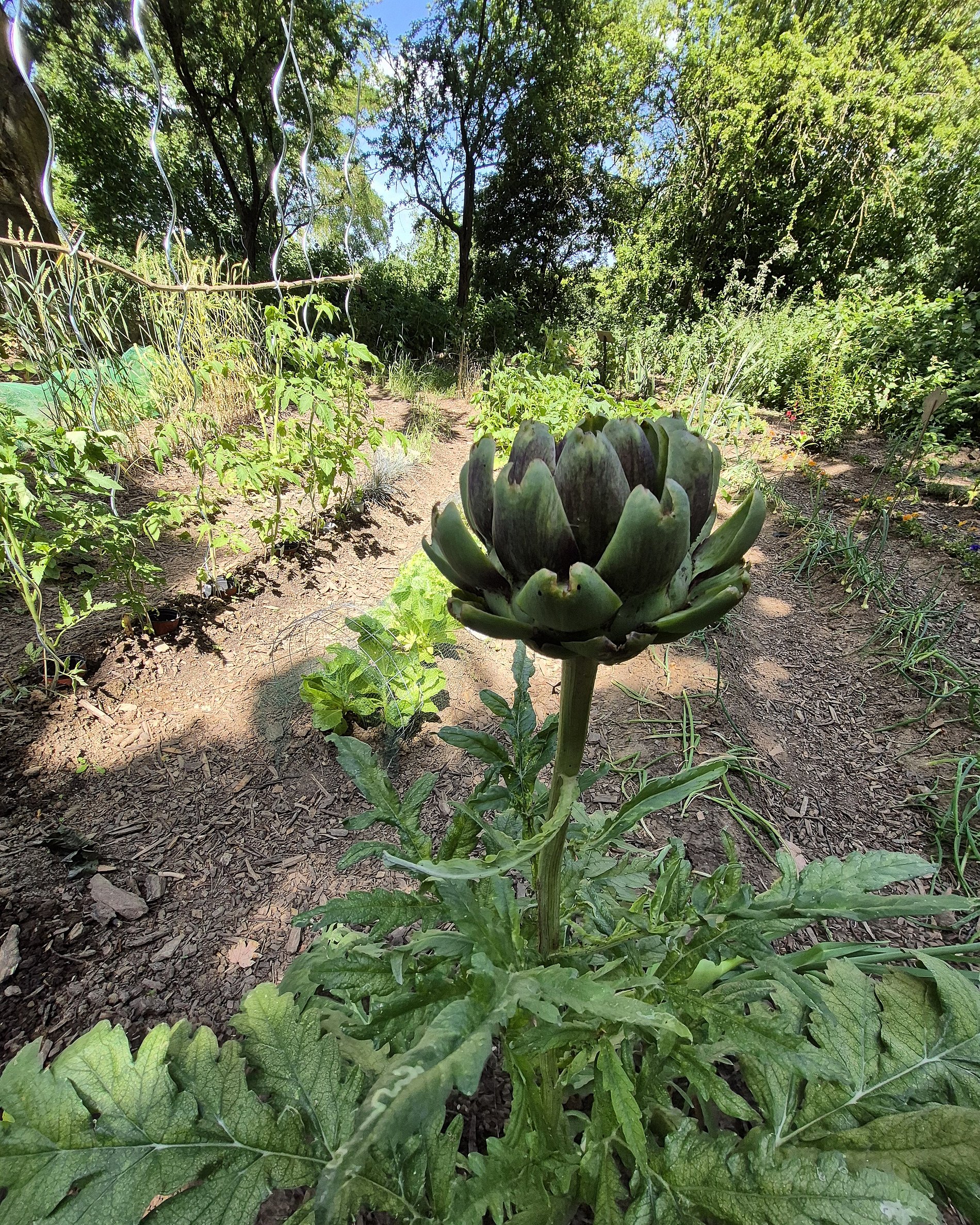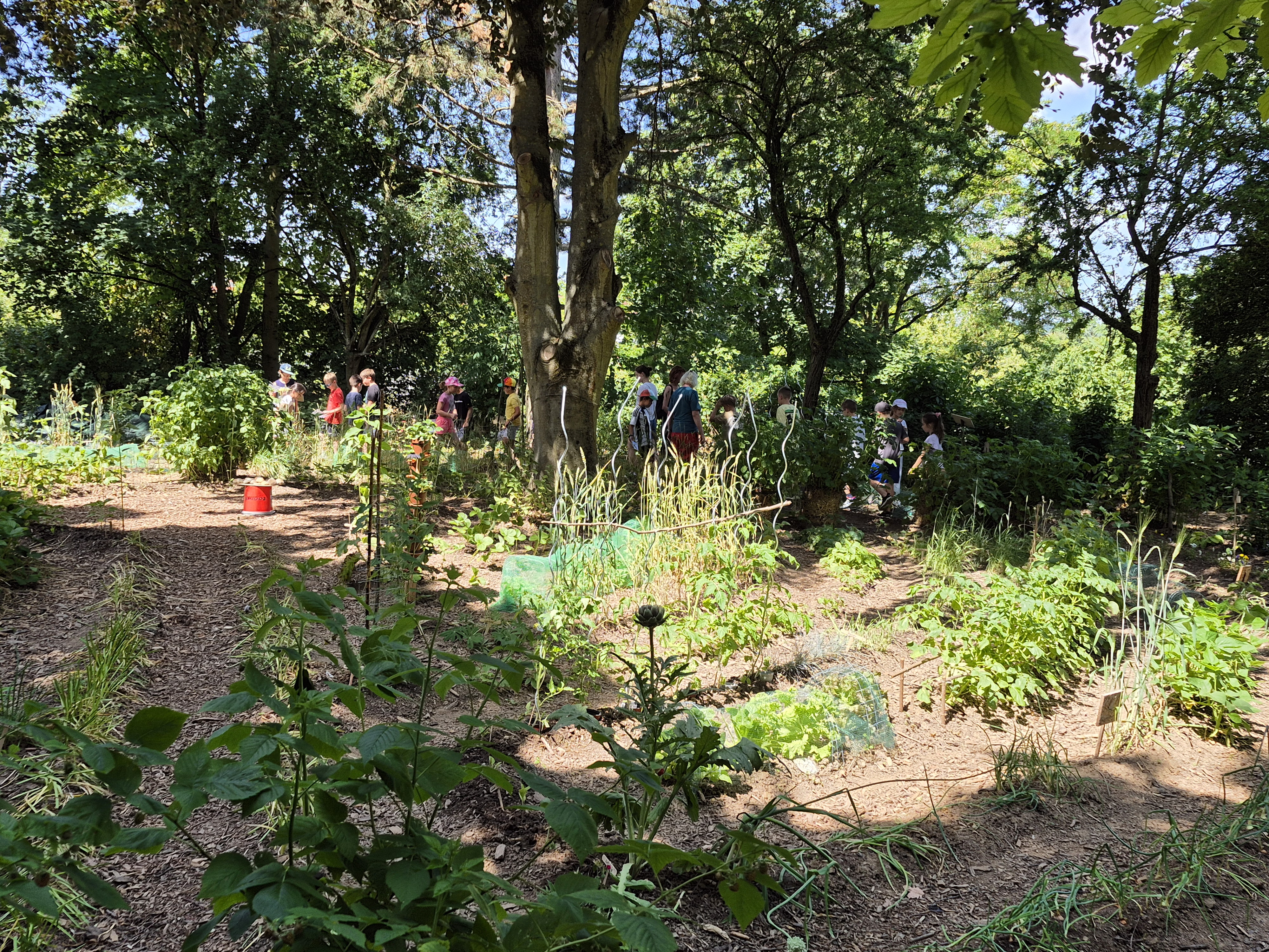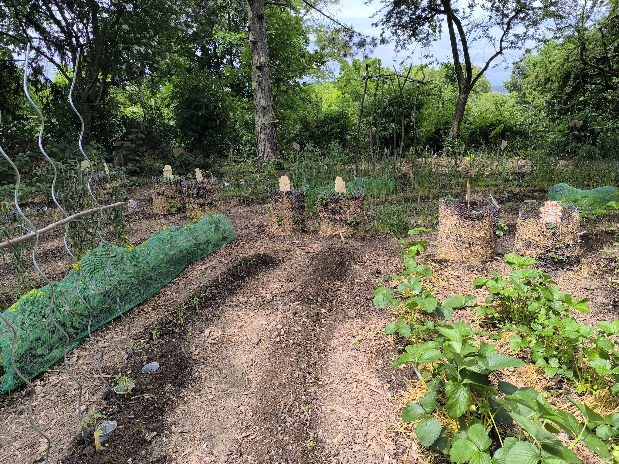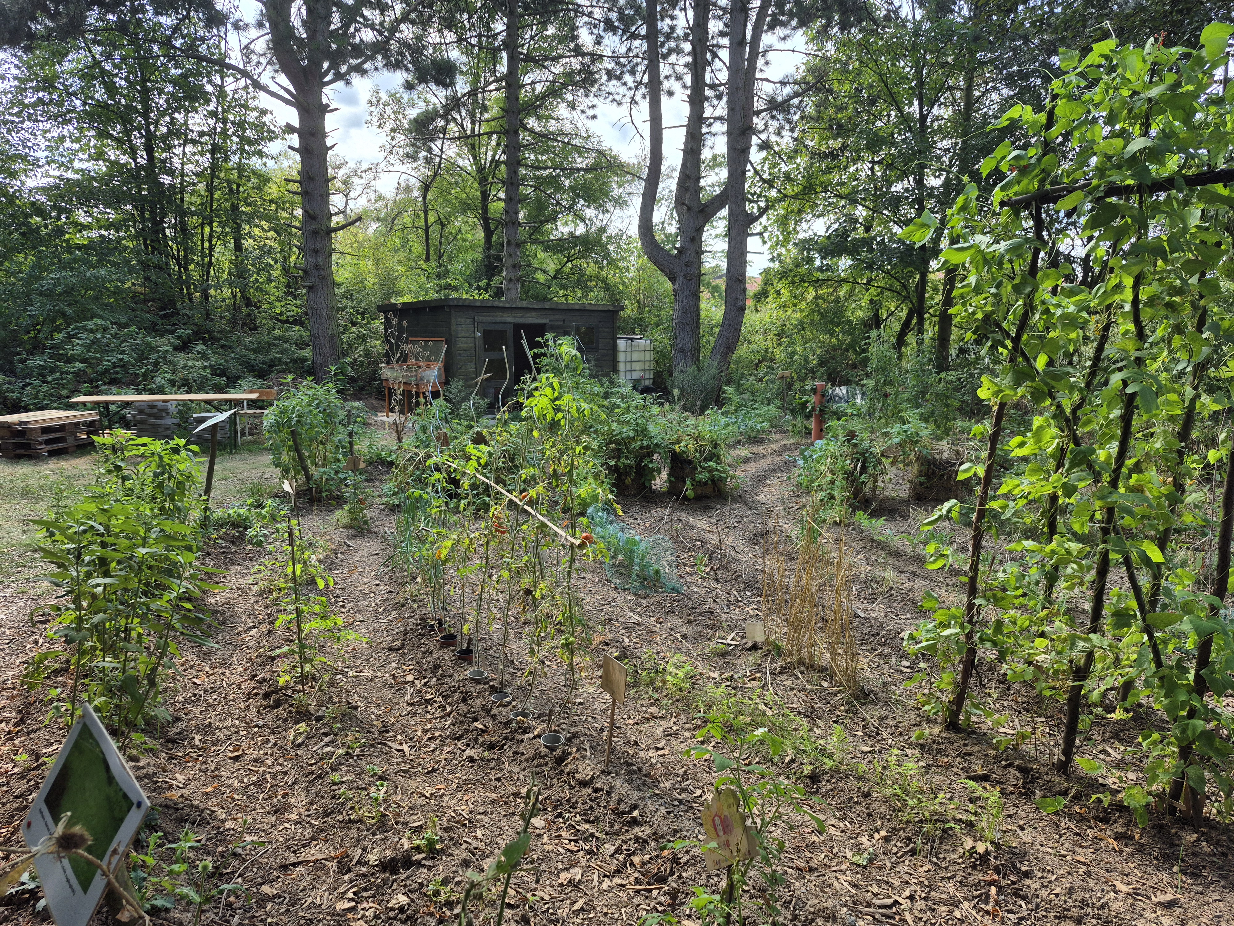 Blüh- und Nutzpflanzen zwischen den Wegen bilden eine abwechslungsreiche Wegführung. So ergibt sich vielleicht eine kurze Meditation an der Kartoffel-Kurve? Oder vielleicht horchen Sie mal aufmerksam auf das Summen der Bienen in der Kräuter-Wende? Beobachten Sie doch mal die Bohnen-Schleife im Jahresverlauf, wie sie in den Himmel wächst. Oder naschen an der Himbeer-Hecke.